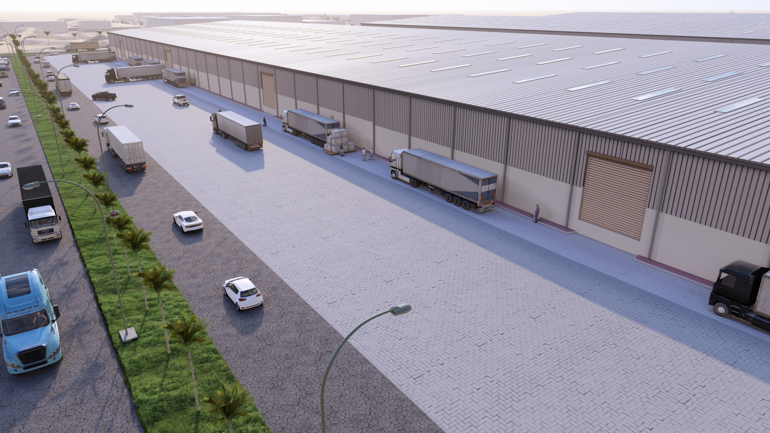 The project includes the construction of three steel shed buildings, containing 15 warehouse spaces. The design will feature Pre-Engineered Buildings (PEB) for the steel structure, sandwich panel for the roof cladding, and hollow core slab as partitions.